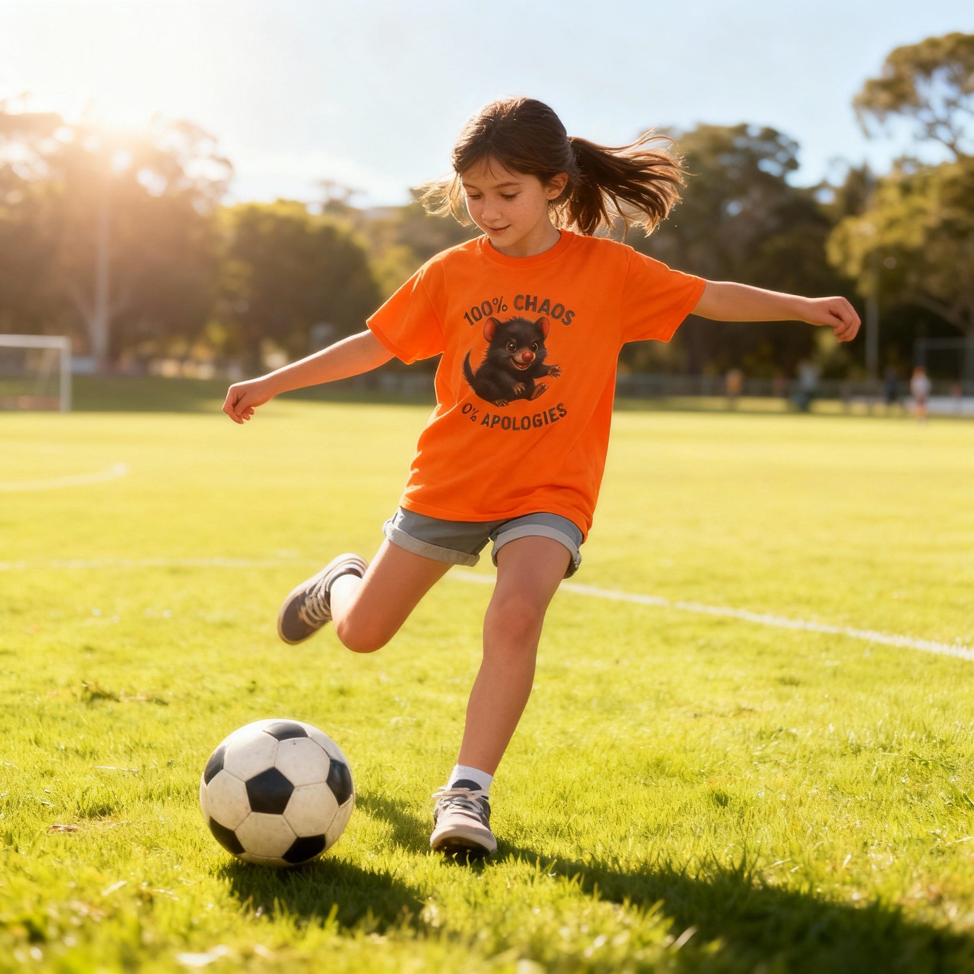 100% Chaos 0% Apologies – Kids T-Shirt | Tasmanian Devil Design | Gumleaf Gang Mischief Makers