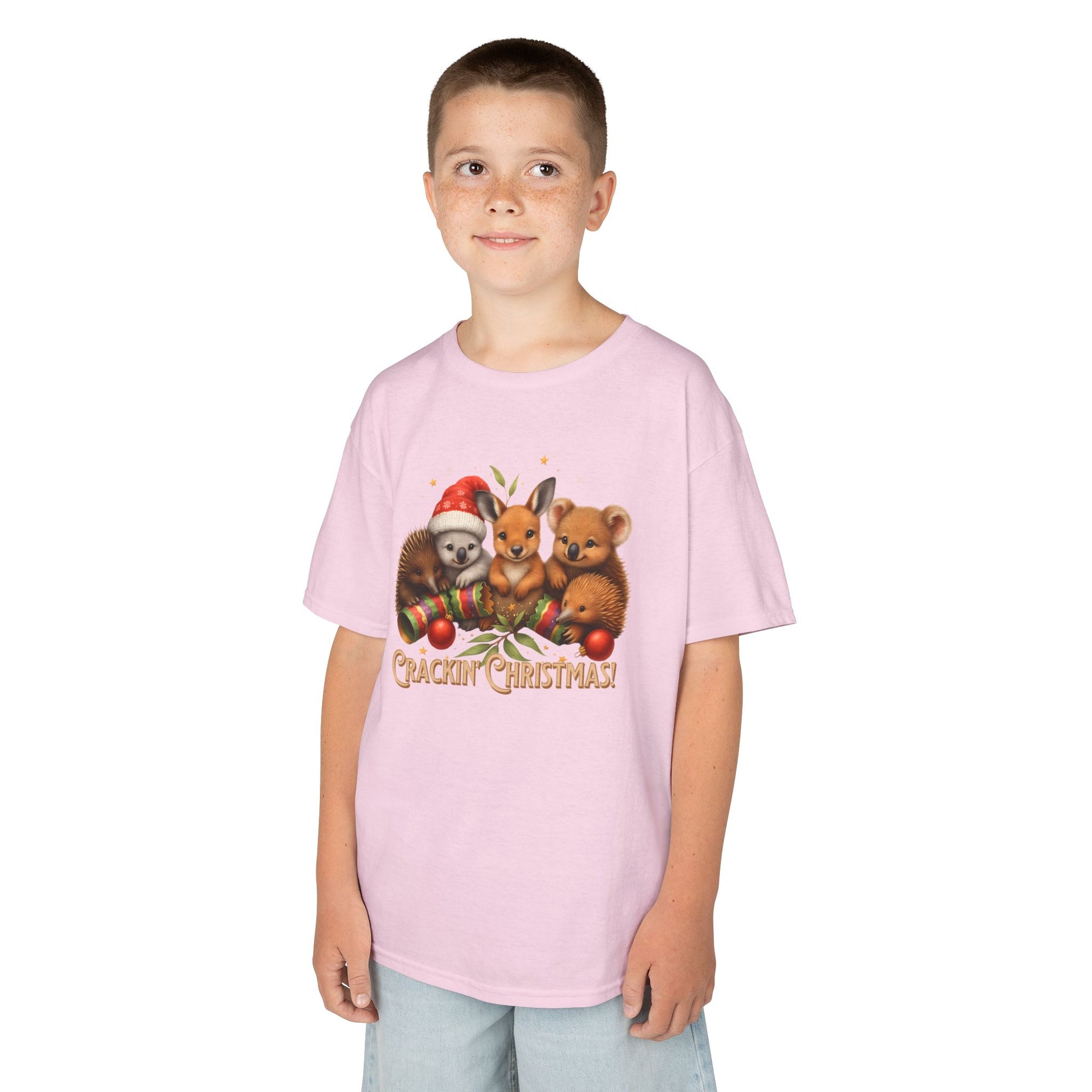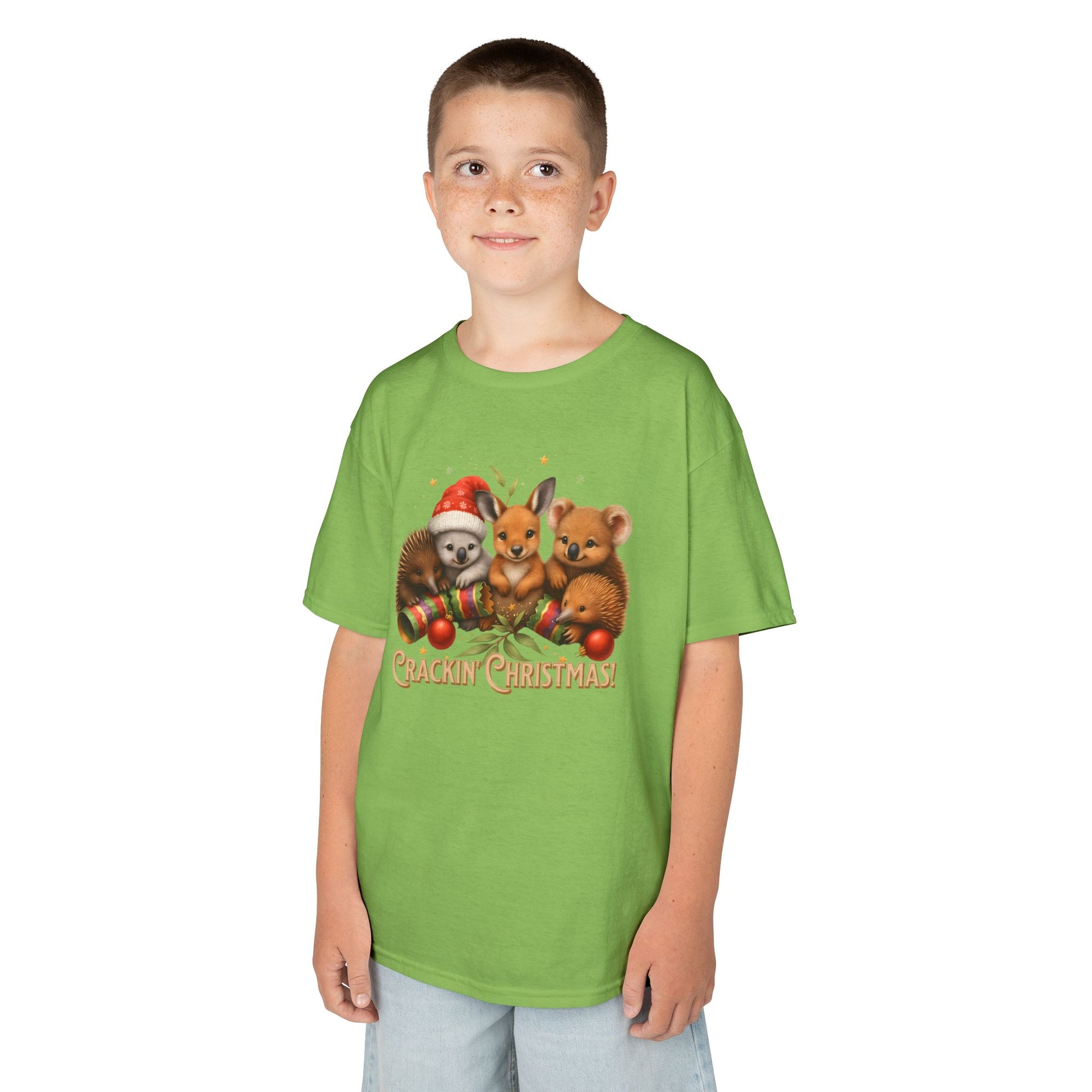 Crackin’ Christmas – Kids T-Shirt | Aussie Wildlife Koala, Kangaroo and Echidna | Gumleaf Gang Festive Friends
