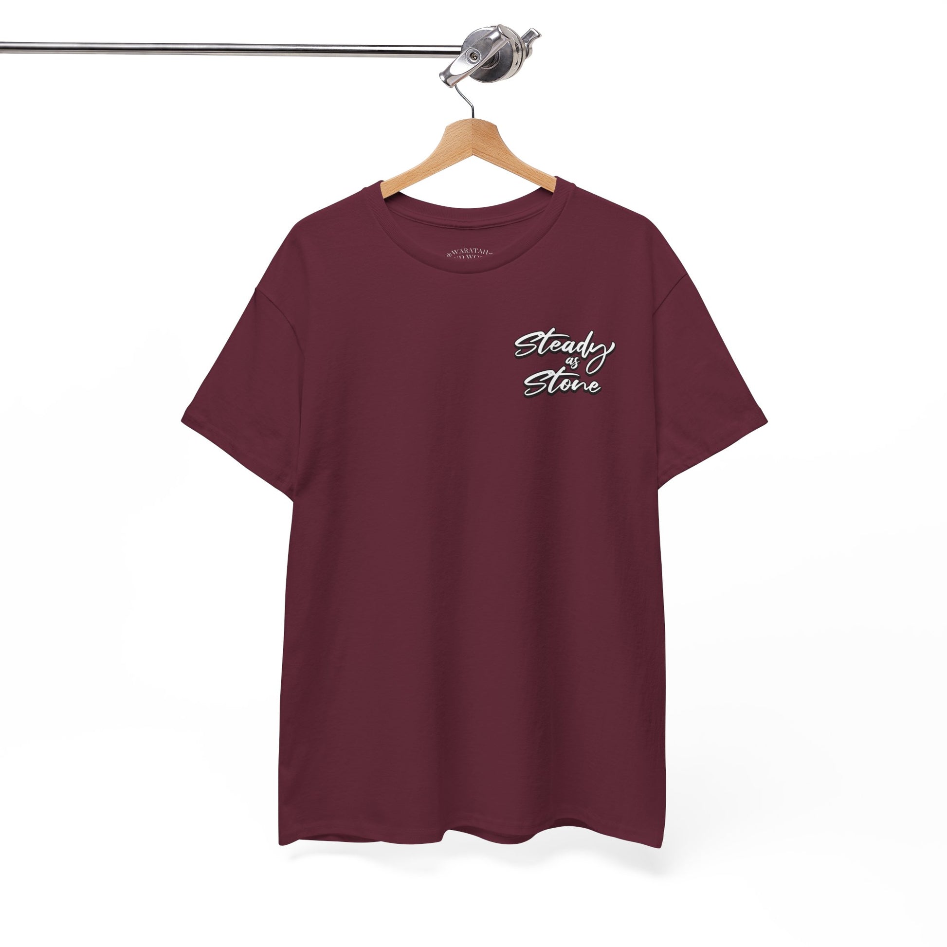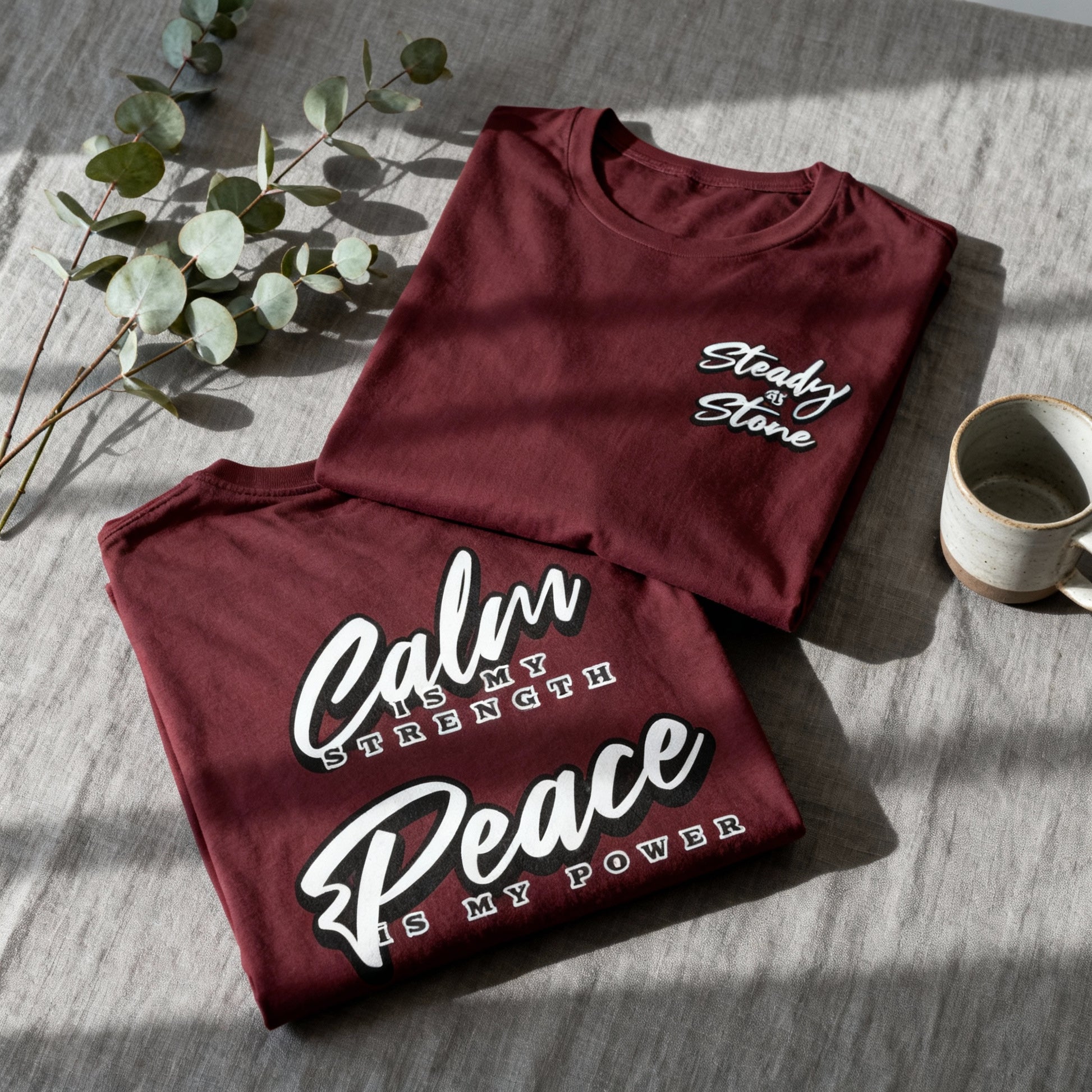 🪶 “Steady as Stone” on the front — a reminder to stay centered,